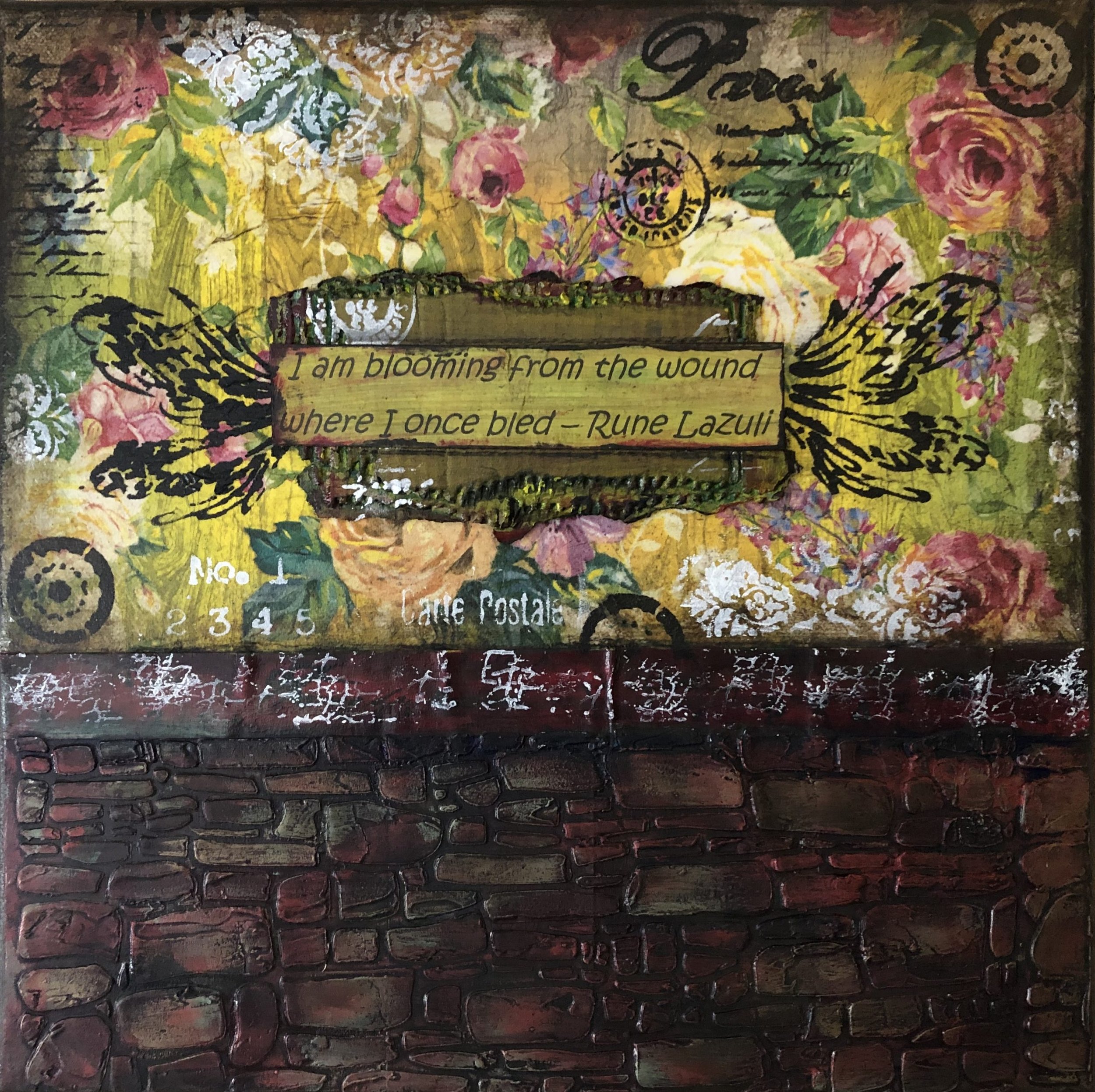 So the back story on this art piece. It popped us as a memory in my Facebook newsfeed from a couple of years ago "I am blooming from the wound where I once bled" - Rune Lazuli. When I saw it, I knew I must create it and write it. The creating was the easy part, the writing is harder. But, as with everything I create and everything I have the honor of writing about, I know that it is worth the cost of the revisiting because it will speak to someone- He promised it.