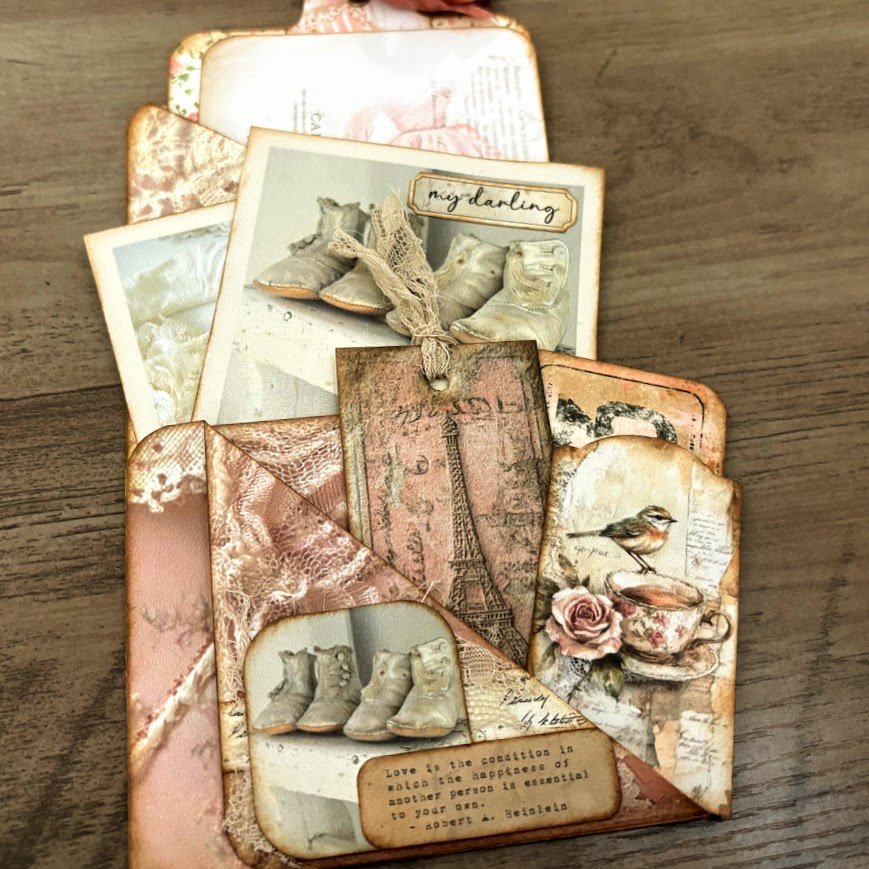 This design is created from a single 8 1/2 x 11 sheet of paper and folded to form multiple pockets. I focused on building gentle vintage layers with lace, paper, and focal elements to create something that feels both functional and beautiful.